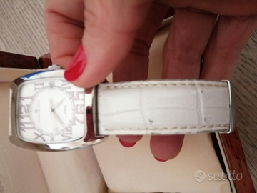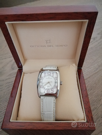 Vendo orologio Officina del Tempo con movimento al quarzo. Cassa in acciaio con numeri rosa e indicazione del giorno. Cinturino in pelle sostituibile in base alle proprie preferenze, la clip di chiusura rimane quella originale in acciaio con logo anche in caso di sostituzione. Completo della sua custodia.