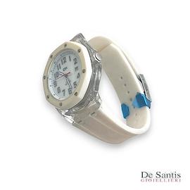 Marca: OK Tipo: Orologio da polso Cassa: Plastica, 40mm Quadrante: Madreperla bianco Datario: A ore 3 Numeri: Arabi, neri Cinturino: Gomma bianca Stile: Elegante, casual