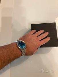 Il tempo cassa 38 mm esclusa corona quadrante blu azzurro cinturino in acciaio adattato ma di ottima qualità per il resto tutto originale vetro plastica con poccolissimo difetto ore 5 posso valutare un eventuale scambio con skin diver svizzeri messi bene