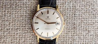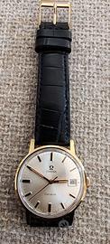 Orologio Omega placcato oro 18 kt 20 micron degli anni '60 con movimento meccanico con 17 rubini, a carica manuale. Cassa in acciaio da 35 mm, quadrante champagne con indici a rilievo, secondi centrali e data a ore 3. L'orologio è coevo e originale in tutti i suoi componenti meccanici, corona inclusa.Dimensioni Diametro cassa: 35 mm. Spessore cassa: 9 mm. Larghezza cinturino: 18 mm. Lunghezza cinturino: 215 mm.