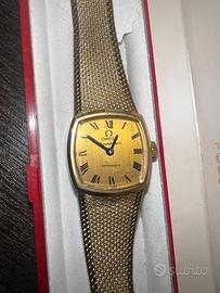 cassa in oro giallo 18kt, quadrante oro, indici applicati, movimento a carica manuale, bracciale integrato in oro giallo 18kt, lungh. cm 18, vetro plastica, gr. 60