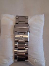 Orologio Orient Diver mai utilizzato, movimento automatico , ref. 147-FEM7R003W9, 21 jewels, quadrante bianco , indici e lancette luminescenti, cinghia in acciaio, cassa in acciaio inox diametro 45mm e spessore 12,5mm. corona a vite, immersione 10atm (100mt). vetro minerale. completo di scatola e documenti. Le fotografie sono descrittive della qualità e stato dell'orologio, la restituzione non è consentita.