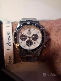 Vendo orologio Orient Kamasu Solar Chrono RA-TX02 colore panda (quadrante bianco con contatori neri), in ottime condizioni e perfettamente funzionante. - Movimento solare Orient (ricarica a luce, nessuna batteria da sostituire) - Funzione cronografo - Vetro zaffiro antigraffio - Impermeabilità 200 metri (20 ATM) - Cassa in acciaio inox - Ghiera girevole unidirezionale - Bracciale in acciaio con chiusura deployante Orologio sportivo ma versatile, perfetto sia per uso quotidiano che estivo. Condizioni: pari al nuovo, con minimi o assenti segni di utilizzo. Completo di: - Scatola originale - Documenti - Maglie aggiuntive del bracciale Possibile consegna a mano in zona Milano Est o spedizione a carico dell’acquirente. Vendita tra privati con formula “visto e piaciuto”. L’oggetto è descritto in modo accurato ed è funzionante al momento della vendita. Disponibile per qualsiasi informazione o foto aggiuntiva.