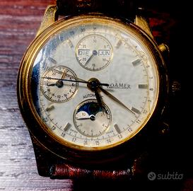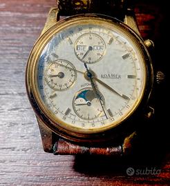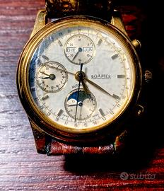 * cronografo, fasi lunari, automatico •Corredo: Include la sua scatola originale Roamer con pellicola nel vetro * Cinturino: Nuovo, appena sostituito (non originale). * Specifiche tecniche: Fondello in acciaio, resistente all'acqua 3 ATM, diametro classico ed elegante. carica automatica Valjoux 7751, una "grande complicazione" che offre: cronografo, fasi lunari, indicazione delle 24 ore e calendario completo (giorno, data, mese). Condizioni: L'orologio è completamente funzionante. Presenta segni di utilizzo (graffi) sulla cassa e sul fondello come visibile in foto, ma conserva il fascino originale del tempo Placcatura in oro di alta qualità da 20 micron Sono 2 orologi identici Uno € 650 Revisionato con garanzia € 850 Anche ritiroin zona