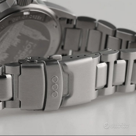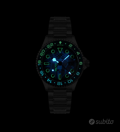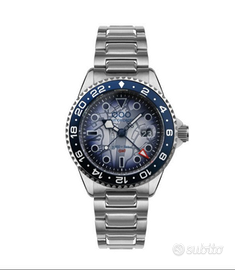 MOVIMENTO: Swiss Ronda 515 24h – al quarzo FUNZIONI: ore, minuti, secondi, data, doppio fuso orario CASSA: acciaio inox 316L con bordi smussati ed esclusivo trattamento di invecchiamento OOO® DIAMETRO CASSA: Ø 40 mm DA ANSA AD ANSA: 48,10 mm SPESSORE: 11 mm PESO: 145 gr IMPERMEABILITÀ: 10 ATM (100 metri / 330 piedi) QUADRANTE: grigio "bruciato dal sole" con mappa di Londra nascosta e Big Ben visibile di notte con Superluminova® C3 e inserti BGW9 (luminescenza verde e blu), logo applicato, finestrella della data nera INDICI E LANCETTE: acciaio inox 316L blu opaco IP con Superluminova® C3, lancetta GMT rossa con Superluminova® BGW9 LUNETTA: girevole bidirezionale, acciaio inox 316L, bicolore nero/blu con numeri incisi e inserti Superluminova® C3 e BGW9 CRISTALLO: zaffiro con lente d'ingrandimento a ore 3 CORONA: a vite, in acciaio inox 316L con logo in rilievo FONDELLO: a vite, in acciaio inox 316L inciso al laser con Big Ben e coordinate di Londra BRACCIALE: maglie in acciaio inox 316L massiccio con sezioni alternate spazzolate e lucidate CHIUSURA: deployante con blocco di sicurezza e microregolazioni LARGHEZZA: 20 mm