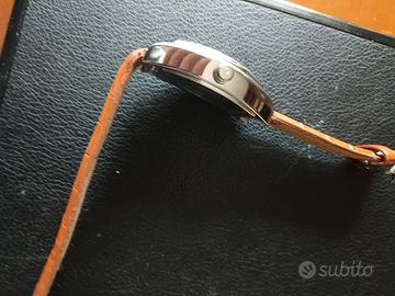 Orologio con cassa "tonneau" ovale mm. 35 x 43 in acciaio inox, quadrante bianco creme chiaro, indici delle ore a grandi numeri arabi in corsivo, datario alle ore 6. Movimento a carica automatica. Cinturino in pelle tinta cuoio a stampa coccodrillo. Nuovo mai indossato.