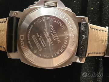 panerai chrono daylight full set originale, cinturino in gomma e in pelle più uno in pelle nuovo,revisionato maggio 2022, ottimo stato, mai lucidato, scontrino originale BOUTIQUE PANERAI FI, visibile zona pisa previo accordo, gradito ritiro a mano o in banca dove viene custodito, eventuale spedizione assicurata a carico del compratore.ringrazio dal farmi offerte all eccessivo ribasso.