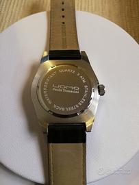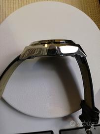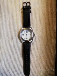 Orologio uomo in acciaio inox e cinturino in pelle color nero con impuntura arancio - design Paola Tomasini originale - quadrante bianco con datario - costruzione e aspetto importante. Dimesioni cassa 47 mm Spessore cassa 13 mm Peso 121 grammi Water resistent 3 atm./30mt. Orologio in ottimo stato di conservazione e perfettamente funzionante.