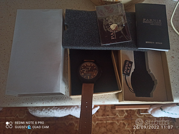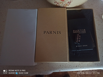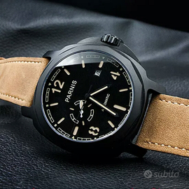 Orologio stile pilota militare. Prodotto dalla fabbrica di orologi Parnis ha un movimento carica automatica con 21 rubini con un affidabile Japan miyota 821A. La cassa in acciaio 316L in PVD nero da 44mm con uno spessore di 15mm. Il quadrante nero con lancette caffè luminescenti reca i l'indicatore H24 alle ore 9 con base a doppio strato sandwich. L'orologio è dotato di vetro minerale antigraffio con fondello in acciaio. Cinturino in pelle 22mm. Resistente a 3 ATM. L'orologio è perfetto pari al nuovo essendo stato indossato poche volte, senza graffi e/o danneggiamenti. Spese di spedizione non comprese.