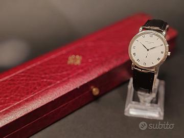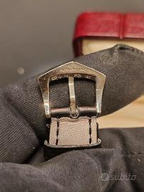 La cassa in oro bianco 18kt (33 mm) è valorizzata dall’inconfondibile lunetta “Clous de Paris”, quadrante bianco porcellana con numeri romani e piccoli secondi ad ore 6. Movimento meccanico a carica manuale, calibro 215.