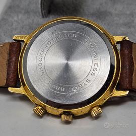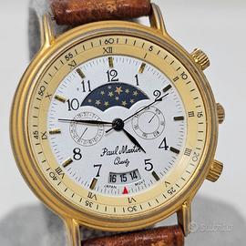Orologio Paul Martin Quartz dallo stile classico ed elegante. Presenta una cassa in metallo dorato, un raffinato quadrante bianco con indici ben leggibili e un cinturino in pelle che aggiunge un tocco di classe. Batteria nuova e perfettamente funzionante. Diametro 37mm.