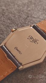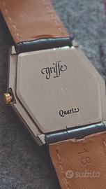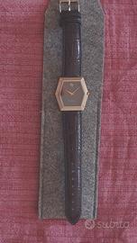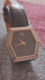 Orologio Paul Picot, collezione Griffe. Cassa esagonale, movimento svizzero al quarzo, solo tempo, con indici, lancette e corona laminate oro, fine anni 80. Cassa esagonale ultrasottile (circa 5,3 mm di spessore) in acciaio con viti a vista sulla lunetta, dimensioni 31,5 x 31,5 mm. Quadrante: di colore grigio scuro con lancette dauphine e il logo "Pp" a ore 12. Per le dimensioni è da considerarsi unisex, cinturino in vera pelle sostituito, senza documenti e confezione originale.