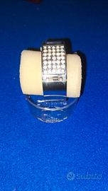 Vendo orologio da signora. Non è munito di batteria ma funzionante. Bracciale rigido con molla e strass (uno purtroppo mancante). Diametro da chiuso: 5,9 cm.