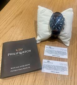 Vendo orologio uomo Philip Watch modello Panama del 2005. Crono con movimento meccanico a carica automatico Valjoux 7750. Cassa in acciaio 38x52mm. Cinturino in pelle nera e fibbia ardiglione, vetro minerale.