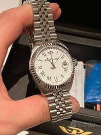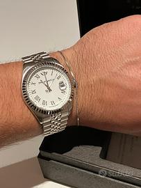 Vendo il mio orologio per passaggio ad altro genere. Comorato qualche anno fa da rivenditore ufficiale, usato poco da domenica o da festivita, si presenta praticamente immacolato nessun tipo di segni d’usura, vetro assolutamente senza graffi o difetti. Dispongo di scatola originale che purtroppo come da foto si e leggermente rovinata, dispongo delle maglie di ricambio per eventuali aggiunte e documenti originali all’interno. L’orologio e perfetto novimento al quarzo, svizzero e precisissimo, batteria cambiata a dicembre 2025. L’orologio è originale, per eventuali altre info o foto scrivetemi pure via subito, non effettuo spedizioni solo ritiri a mano in zona.