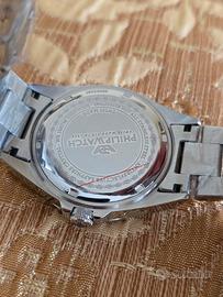 orologio Philip Watch nuovo mai utilizzato ancora con tutte le sue pellicole originali segnalo per trasparenza un piccolo graffio sulla chiera che non si vede neanche a occhio nudo l'orologio è nuovo come si evince dalle foto con movimento al quarzo Swiss Made, vetro zaffiro, impermeabile 100 metri, corona serrata a vite, fondello serrato a vite, spedisco con la sua scatola e contra scatola originale.