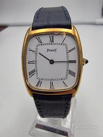 Bellissimo orologio firmato Piaget referenza 9691 con cassa e chiusura in vero oro giallo 18 carati, cinturino non originale in pelle blu stile coccodrillo, carica manuale, vetro zaffiro, diametro cassa 26 millimetri x 30 millimetri.