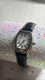 Questo orologio da polso con cassa rettangolare e cinturino in pelle è un modello del marchio italiano Pierre Bonnet