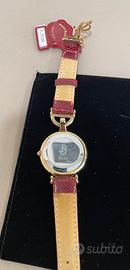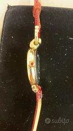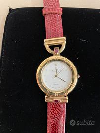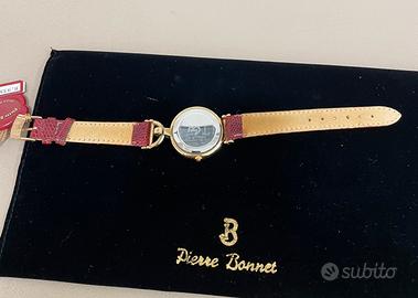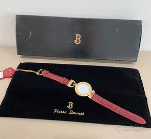 Stupendo orologio donna vintage, Pierre Bonnet modello Vanessa, placcato in oro con pietre rosse, quadrante bianco, cinturino in pelle rossa, perfettamente funzionante e meccanismo svizzero. Nuovo