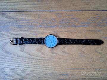 quadrante in metallo dorato, numeri romani,lancette color oro. Cinturino in pelle.