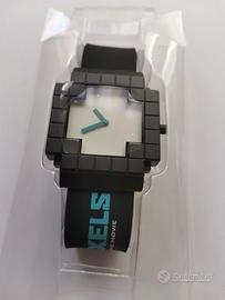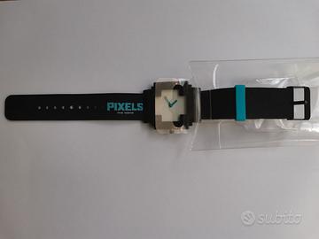 Orologio pubblicitario del film prodotto da Columbia TriStar Pixels del 2015. Cinturino in gomma e quadrante con lancette. Nero e azzurro. Nuovo, nella sua scatola originale, mai usato e ancora con pellicole protettive come da foto