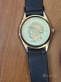 Questo orologio è placcato oro ha un cordino di pelle marrone è di René Valentin QUARTZ con una scritta Mussolini MCMXLIII