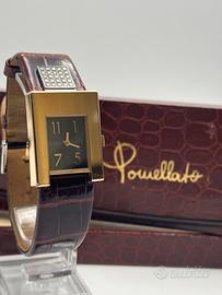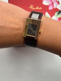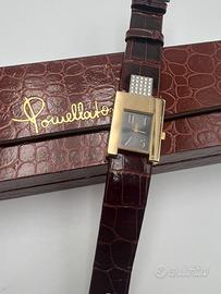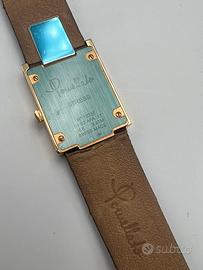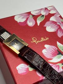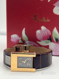 Meraviglioso orologio Pomellato Stress in oro giallo massiccio 18 carati, c9n 25 disnanti naturali taglio brillante per 0.75 ct e quadrante rettangolare grigio, movimento automatico, cinturino in vera pelle, diametro cassa 25x20 mm, anni 2000 circa. cinturino Pomellarto vera pelle coccodrillo