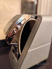 orologio vintage design italiano, cassa rettangolare tonneau in acciaio, cronografo analogico con datario , bracciale in acciaio, scatola originale, come nuovo.