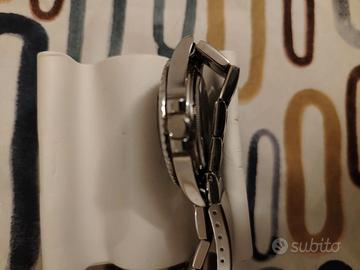 orologio in acciaio quadrante nero dotato di maglie per riportare il cinturino alla lunghezza originale con batteria nuova. piccoli segni di usura. confezione originale con prova di acquisto.