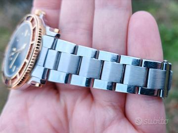 Il suo cuore è un ETA 2824-2 automatico, Swiss Made, sinonimo di affidabilità e regolarità. La cassa in acciaio di circa 40 mm, la ghiera unidirezionale bicolore rosso/blu, il quadrante blu con dettagli dorati e datario a ore 6 raccontano di immersioni, venti salmastri, tramonti sul mare e porti lontani.