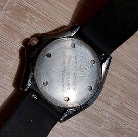 Orologio svizzero al quarzo con stemma dei carabinieri sul quadrante nero, datario al 3, lancette luminescenti, cassa tonneau 40x41 mm con corona serrata a vite. La cassa è in acciaio smaltata di nero, ma su la ghiera unidirezionale e su alcune parti è consunto. Vetro zaffiro con alcune striature, cinturino nuovo in gomma da 215x18 mm e ardiglione nero. Swiss made, waterproof tested 20atm, made by Breitling, modello militare distribuzione unica FF.AA. nr.64350 L .