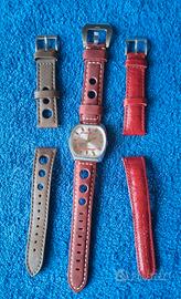 Il quadrante è di un magnetico grigio ardesia, reso vibrante dai dettagli rosso corsa su sfere e indici che gli conferiscono un'anima sportiva e grintosa. Per completare il look, ha abbinato a un cinturino Rally colore cuoio naturale, il contrasto tra la pelle e il quadrante è eccezionale e richiama subito il mondo delle corse d'epoca.