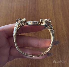 orologio da donna vintage firmato Raymond’s, anni ‘80/‘90, caratterizzato da un bracciale rigido, il quadrante di forma rotonda è sorretto da due teste di leopardo, la sua rifinitura è completa da strass, qualcuno mancante ma facilmente riparabile. il materiale è una lega metallica con placcatura dorata lucidata. meccanismo funzionante, basta inserire la pila.