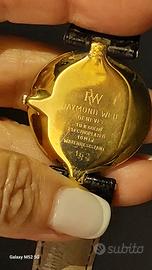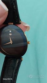 Orologio Raymond Weil, mod.Othello.Diametro 25mm. Cassa placcata,in oro 18k, di forma curva.Quadrante nero con diamante a 12.Movimento al quarzo. Vetro zaffiro.Cinturino in pelle. Usato, pero in buone condizioni. Unico difetto mostrato sul foto/manca un pezzettino di vetro/.