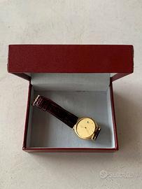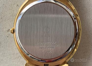 Vendo classico orologio Revue Made in Svizzera modello 61 005 extrapiatto, in acciaio placcato oro, con movimento a quarzo e datario. Usato poco e perfettamente funzionante, senza graffi o segni, con confezione originale e garanzia di acquisto. Anni ottanta. Diametro della cassa 32 millimetri corona esclusa.