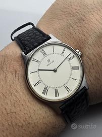 Orologio Revue ultrapiatto a carica manuale, cassa in acciaio da 34mm, lug to lug 39mm, spessore 7,6mm, corona marcata, cinturino nuovo.