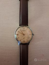 Vendo orologio Revue da uomo degli anni '40, meccanico a carica manuale e funzionante, tiene bene il tempo. Orologio swiss made, come indicato nella parte sottostante del quadrante. La cassa ha un diametro di 36 mm circa, corona esclusa, quindi un po' oversize rispetto alle misure standard dell'epoca, per uno spessore di circa 9 mm. Il cinturino era stato sostituito di recente dal possessore precedente dell'orologio. Quadrante con numeri romani alle ore 12, 3, 6 e 9 mentre presenta indicatori a stanghetta nelle restanti ore. Lancetta dei secondi si trova separata rispetto a quelle delle ore e dei minuti, in una sfera posta a ore 6. Il quadrante e la cassa presentano i segni del tempo, comunque ben visibili dalle foto dell'annuncio. Il vetrino dell'orologio non è originale, è in plastica e ha un leggero gioco che lo fa ruotare.