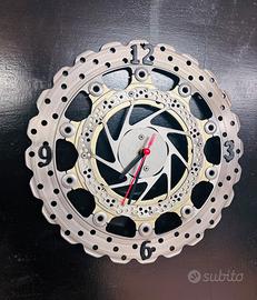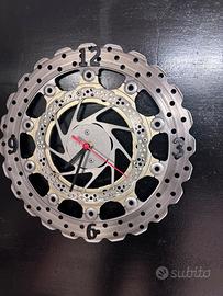 Orologio da muro costruito con componenti meccanici originali (dischi freno moto). La struttura a doppio strato conferisce profondità e un carattere deciso all'oggetto.
