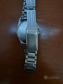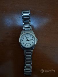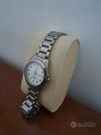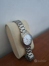 Vendo orologio Rivado da donna al quarzo, funzionante e con pila appena sostituita. Quadrante bianco con indicatori numerici neri. L'orologio possiede il suo bracciale originale marchiato Rivado. Diametro cassa, corona esclusa, di circa 28 mm. Orologio water resistant per una pressione fino a 5 bar.