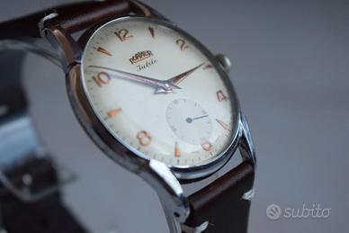 In vendita un affascinante Roamer Jubilè vintage a carica manuale, equipaggiato con il movimento MST calibro 402, uno dei calibri più apprezzati della produzione Roamer degli anni ’50. Come ben visibile dalle foto, si tratta di uno dei primi modelli Jubilè dotati di questo movimento, riconoscibile per la particolare costruzione: il calibro è infatti racchiuso in una cassa interna in acciaio che lo protegge, a sua volta bloccata dal caratteristico fondello con chiusura a scatto, soluzione tecnica tipica dei primi esemplari di questa serie. L’orologio è perfettamente funzionante e mantiene bene il tempo, pronto per essere indossato.