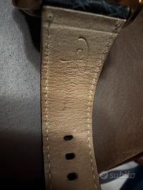 Cassa quadrata color bronzo lucido meravigliosa; quadrante nero con indici applicati bronzati; lancette buanco perla. Cinturino loggato in pelle nera. Finbia loggata. Conservato magnificamente dato lo sporadico utilizzo. Meraviglioso lusso