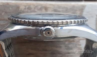 Vendo orologio automatico Rodania, degli anni 70, con quadrante in trizio e ghiera in bachelite, della misura di 41 mm senza la corona che è provvista della valvola per l'espulsione dell'elio. Bracciale in acciaio non marcato Rodania.