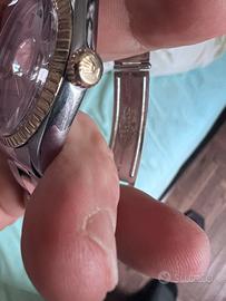 Raro Orologio Rolex Oyster Perpetual Date Ref. 1505 bicolore in oro giallo 18 carati e acciaio inossidabile, anno 1970 (n. 15690) Automatico, il movimento è in condizioni di funzionamento eccellenti // Numero di serie D845XXX Caratteristiche: Quadrante argentato spazzolato in ottime condizioni indici delle ore a blocco obliqui applicati color oro giallo, datario a ore 3 e lancette a bastone color oro giallo con materiale luminescente anticato. È corredato dal bracciale originale Rolex Oyster bicolore in oro giallo 14 carati e acciaio inossidabile, lunetta zigrinata in oro e lente Cyclope per la data. Ha una cassa dal diametro di 34 mm. adatto a polsi fino a 19 cm. È animato da un movimento automatico a carica manuale Calibro 1570 a 26 rubini. Tripla firma. Prodotto in Svizzera. , Revisionato nel 2022 dal concessionario Rolex Gioielleria Giraldo - Rivenditore Autorizzato Rolex ( TV ) Sostituzione vetro con lunetta, asse completo ricarica e o ring +satinatura bracciale . costo 800 € Alcuni segni sul fondello come da foto dovuti all'utilizzo . Attenzione ; no scambi ,no offerte ridicole ,il prezzo non è trattabile !!!!