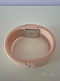 Dettagli del Modello Marca: Liu Jo (Liu Jo Luxury). Modello: Orologio "Bangle" nr. TLJ421, tonalità rosa/pesca. Anno di uscita: Questa collezione risale approssimativamente al periodo 2013-2015. Caratteristiche Tecniche Struttura: Orologio "a scomparsa" integrato in un bracciale rigido di tipo bangle. Materiali: Bracciale in policarbonato o plastica-ceramica. Design: Logo "LIU JO" in acciaio 316L applicato sul fronte, impreziosito da strass o cristalli. Movimento: Generalmente monta un movimento al quarzo (solo tempo). Chiusura: Il quadrante è nascosto sotto una parte del bracciale che si solleva o si sposta, e la chiusura è tipica dei bracciali rigidi a scatto. Vendesi per inutilizzo. Sprovvisto da scatola originale.