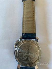 Orologio meccanico di produzione russa. Originariamente prodotto per il Dipartimento della Difesa dell’Unione Sovietica a partire dal1965. Diam cm 35 cadsa in acciaio, cinturino in pelle blu