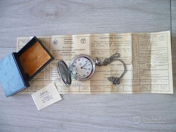 Vendo per fine collezione Orologio Russo Molnija Marnna cipolla da taschino, produzione Unione Sovietica CCCP anno 1988, raro quadrante marchiato, carica manuale, completo di catenella, astuccio e certificato originali, fondo di magazzino assolutamente come nuovo e perfettamente funzionante 90 euro