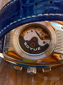 Bellissimo e raro orologio Soyuz made in Russia anni 90 .. con il calendario completo. Giorno… data .. mese .. e luna e sole .. movimento Automatico perfetto in tutto.. tutto marchiato Soyuz.. i quattro pulsanti servono per cambiare tutte le funzioni..