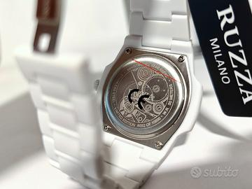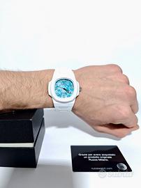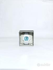 Design moderno con cassa bianca e quadrante in pietra turchese, cinturino in resina e chiusura deployante . Movimento al quarzo preciso e affidabile.