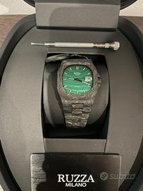 Salve a tutti, come d'annuncio metto in vendita Ruzza Watch Luxury, versione con quadrante in vera pietra malachite , prodotti solo 100 pezzi al mondo . Insieme all’orologio viene venduta la box da viaggio in pelle, la card in metallo (certificato di autenticità) con numerazione e colore del quadrante e un cacciavitino per la rimozione delle maglie. Di seguito alcuni dati tecnici: -EDIZIONE LIMITATA E NUMERATA -OROLOGIO SWISS MADE COME DA FOTO -VERSIONE FULL FORGED CARBON -MOVIMENTO SW200 TOTALE ALTEZZA STIMATA SOTTO I 11.00mm -QUADRANTE IN VERA PIETRA NATURALE Malachite Onice Turchese Occhio di tigre Lapislazzuli VETRO ZAFFIRO -PESO TOTALE 68 GRAMMI -ROTORE TRAFORATO MODIFICATO -DATA A ORE 3 -CONTAINER FONDO IN TITANIO BLACK -CASSA IN FULL FORGED CARBON -BRACCIALE IN FORGED CARBON CON REGOLAZIONE VITI PVD BLACK -CORONA IN CARBONIO A VITE -LENTE SU DATA -SFERE SUPERLUMINOVA C1 -FONDO IN TITANIO CHIUSO CON 4 VITI -FONDELLO ZAFFIRO MOVIMENTO A VISTA -IMPERMEABILE FINO A 10 ATM -BOX IN SOFT TOUCH CON COPERCHIO A VISTA