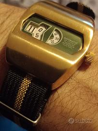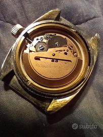 Orologio saltarello con cassa portata a metallo di base, vetro sostituito con lamina di simil policarbonato a protezione del quadrante NOS con movimento automatico swiss made ronda 1283-21 fondo di magazzino appena sostituito. Per collezionisti ed appassionati.